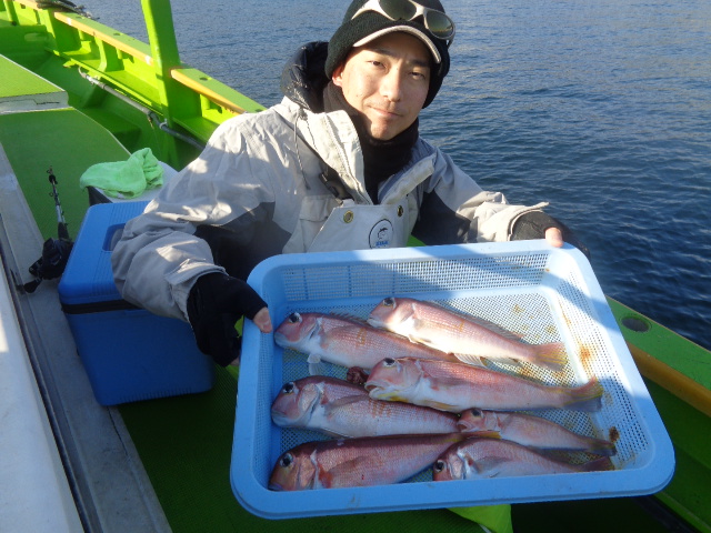 私は朝から下浦沖をやって行きました、海上や潮の流れも穏やかな20~30mのポイントを小さく移動しながら船中ポツポツ釣れて、手の合う方は短い連チャンを何度か出来て数を伸ばして行けました。