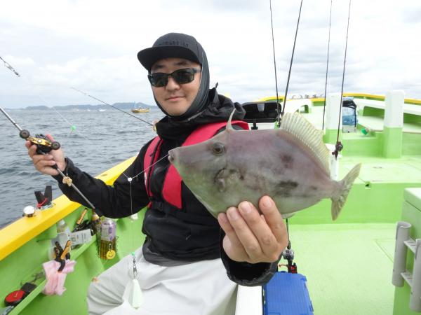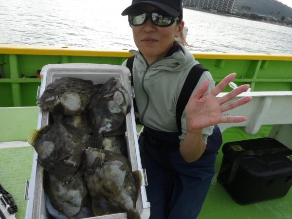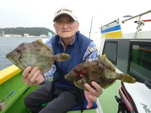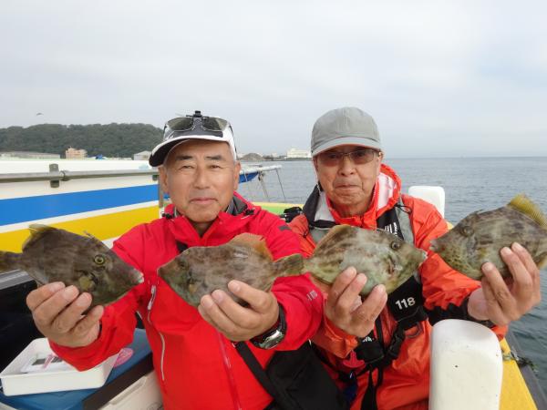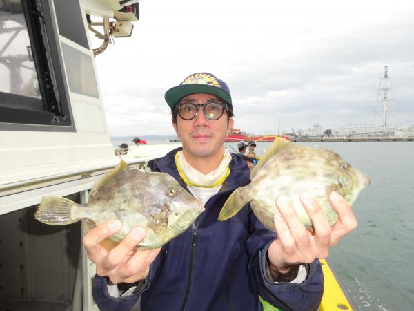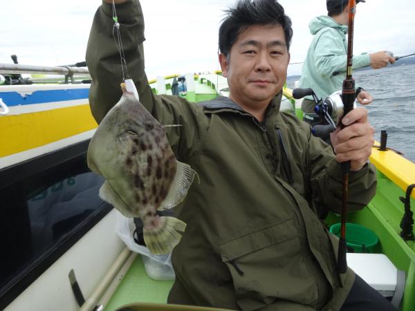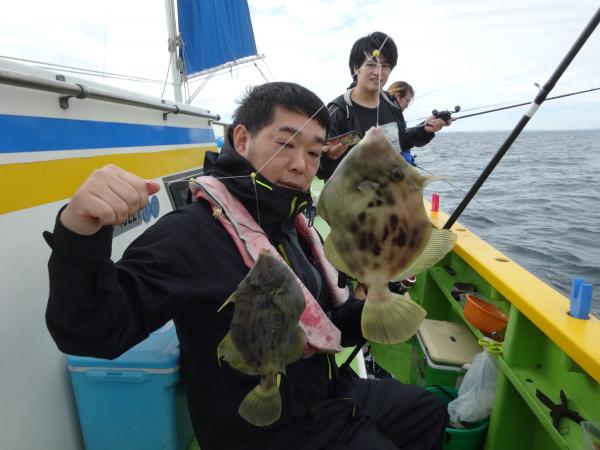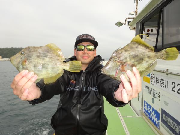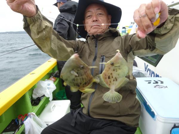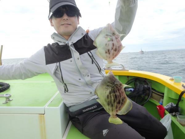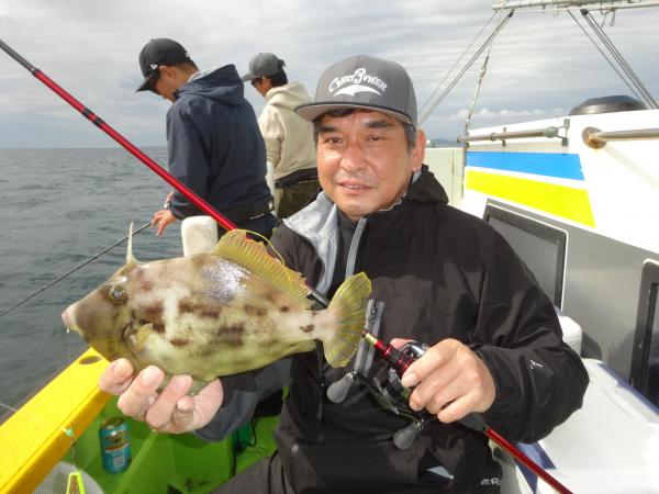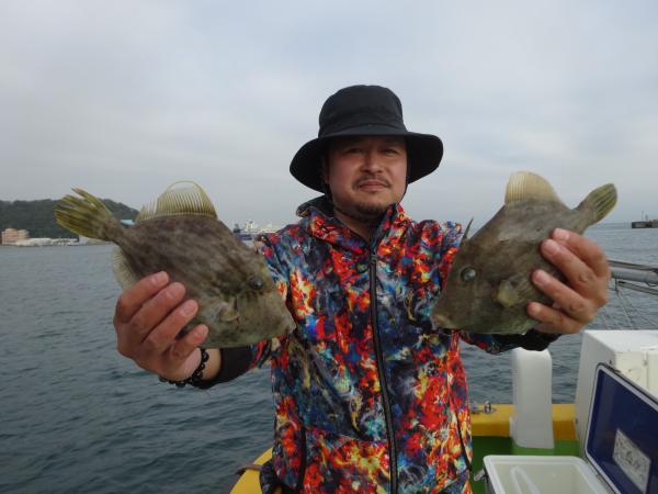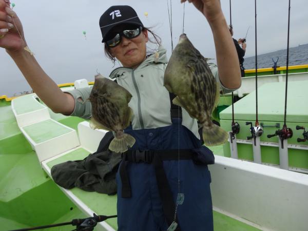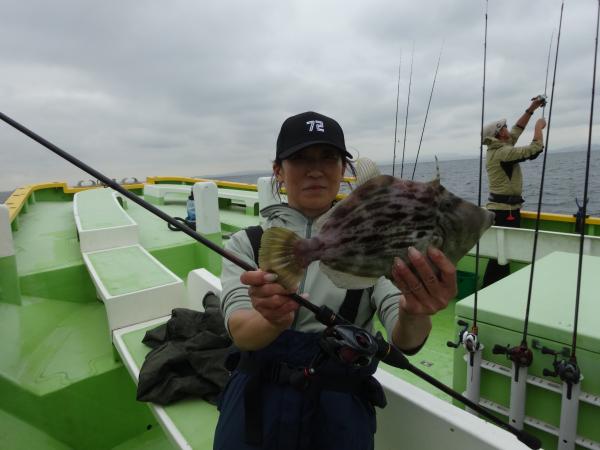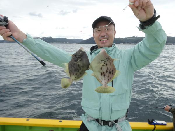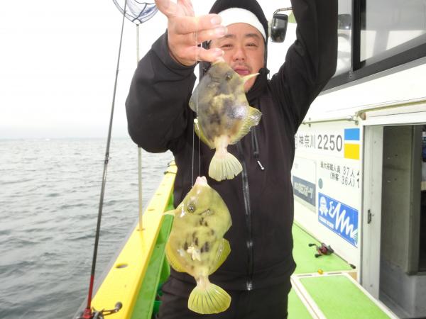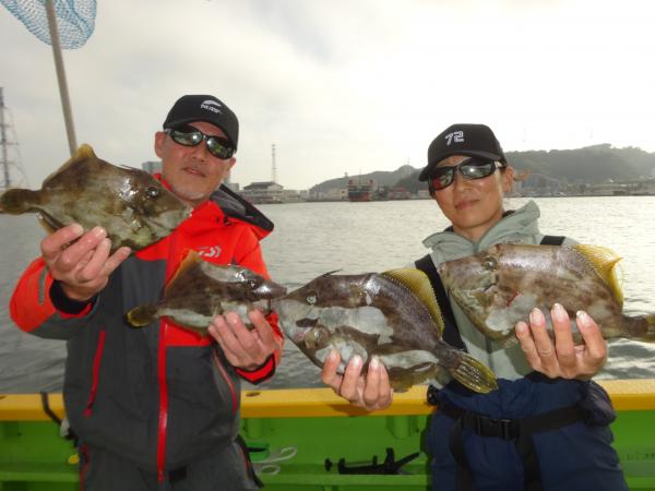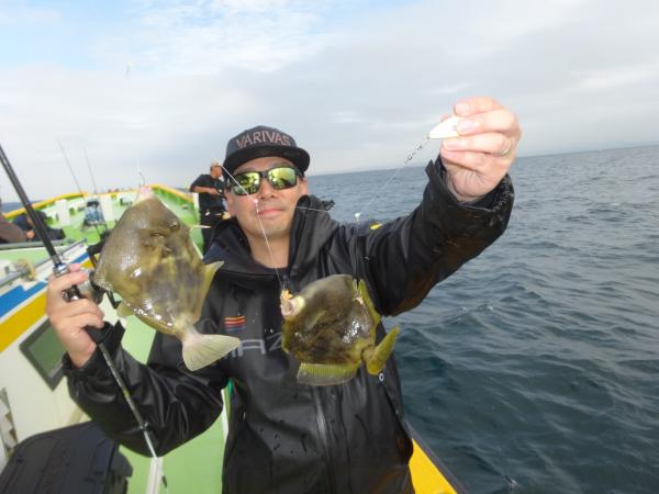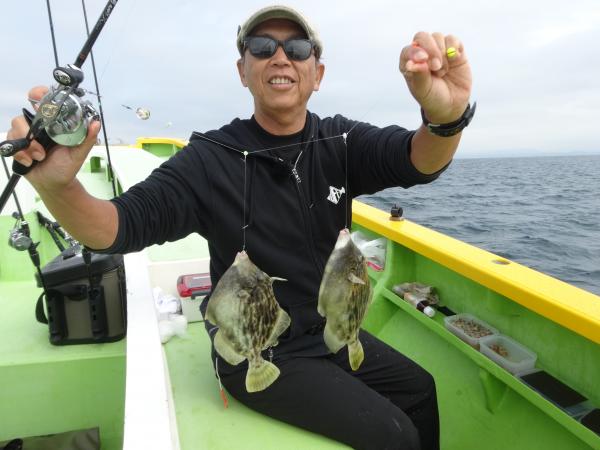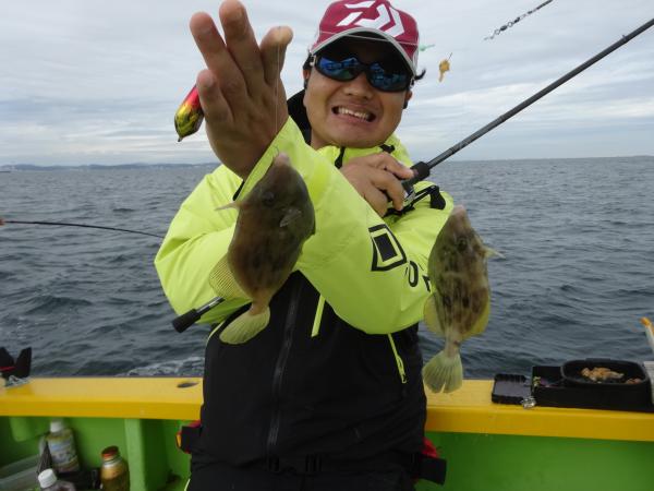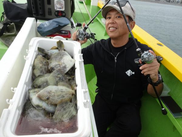 今日は朝から小雨が降ったり止んだりの一日で、どんより暗い空模様でした。 この所、朝一に好調な20m前後のポイントからスタートしました。 今日も潮色は明るい良い状態でしたので、直ぐに船中ポツポツ釣れ出して連チャンモードに入れましたが、船がどんどん集まって密集状態になって、カワハギのアタリも早々に引いてしまいました。 モーニングサービスが出来なかったですが、少しずつ浅場ポイントに移動しながら数を伸ばして行けました。 全般に活性が良く、どのポイントでもアタリ多く出て、ダブルや連チャン場面を見れたので、、ビギナーの方や貸し竿の方達もポツポツ釣れて楽しめたと思います。 但し相変わらずフグも乱入して来るので、仕掛けや替え針は多めにご用意下さい。 時々良型も混って、今日も皆さん美味しいお土産が出来て、自分の釣り技がハマった名手は、ダブルも複数回決めて大漁釣果に持って行けました。 今日のトップは、藤井さんが37枚の大漁、次いでエース池田君も僅差の36枚、矢島さん28枚…と続きカワハギ釣り初めたばかりのお姉さんも15枚の大健闘、貸し竿の若者も14枚ずつゲットの大健闘でした。
