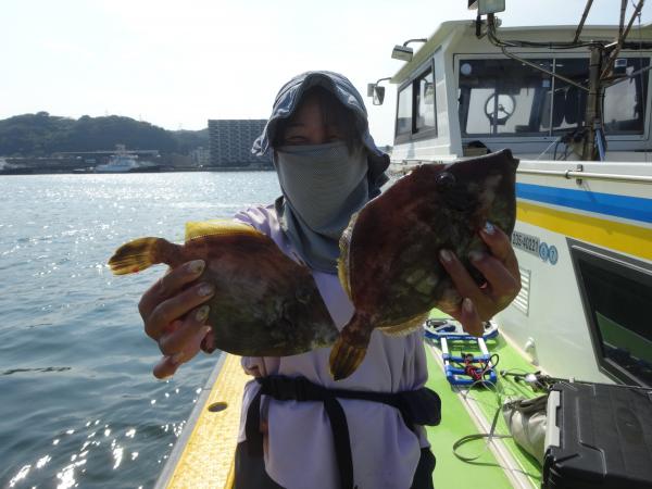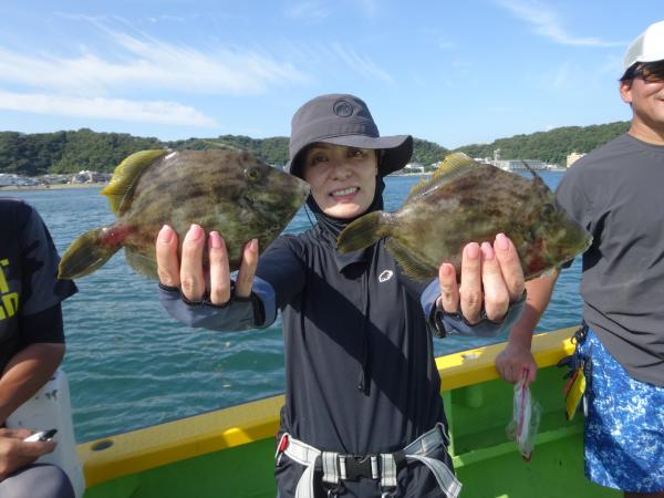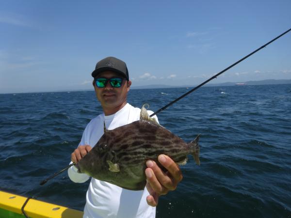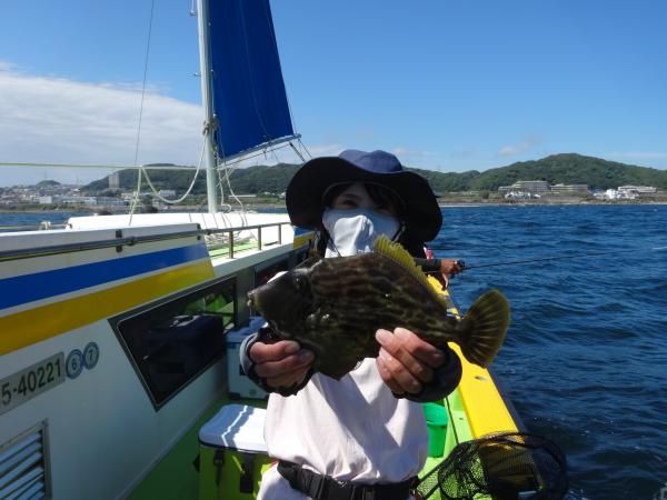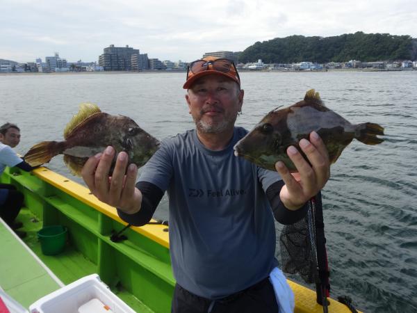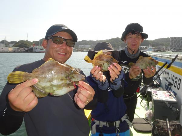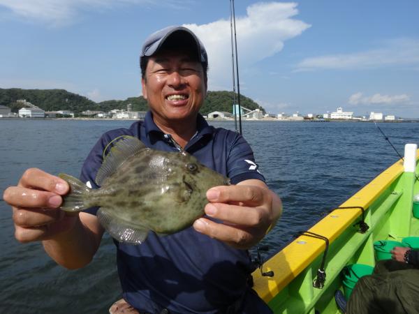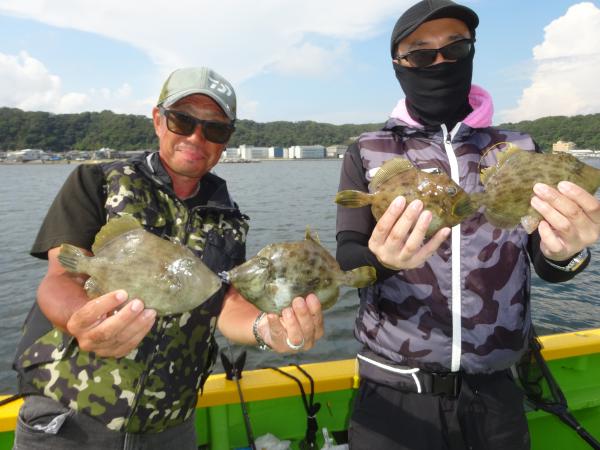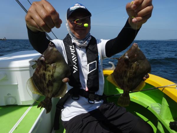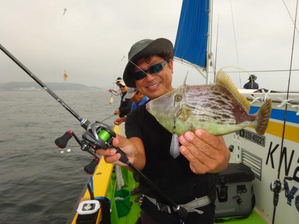 私はDaiwaの仕立船で、久しぶりの剣崎沖なので、浅場の定番ポイントから様子を見ながら、少しずつポイントを変えて好ポイントを探って、各ポイントでキタマクラ等の外道に邪魔されながらも良型や大型カワハギを船中でポツポツ釣れました。