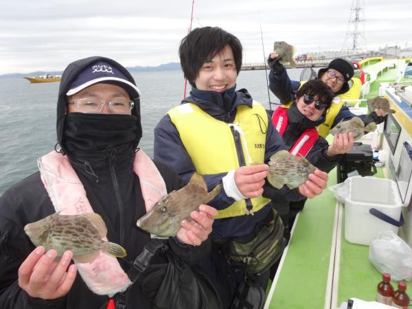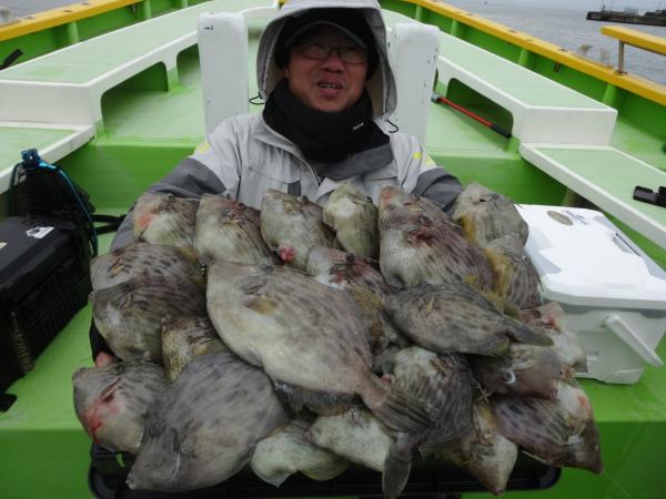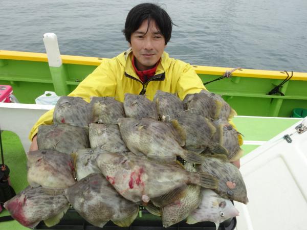今日のトップは関西の名手.播磨さんが泣き尺の大物含む24枚の好釣果、次いで高杉さん21枚と続きカワハギデビューの女性を含む多くの方がツ抜け達成の好釣果でした。