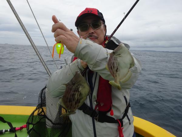 私はカワハギ船団から離れて、細かなポイントを転々と探索しながらで、好ポイントに当たると良型や尺ハギ混りでポツポツ釣れて、ダブルやトリプルの場面も見れました。
